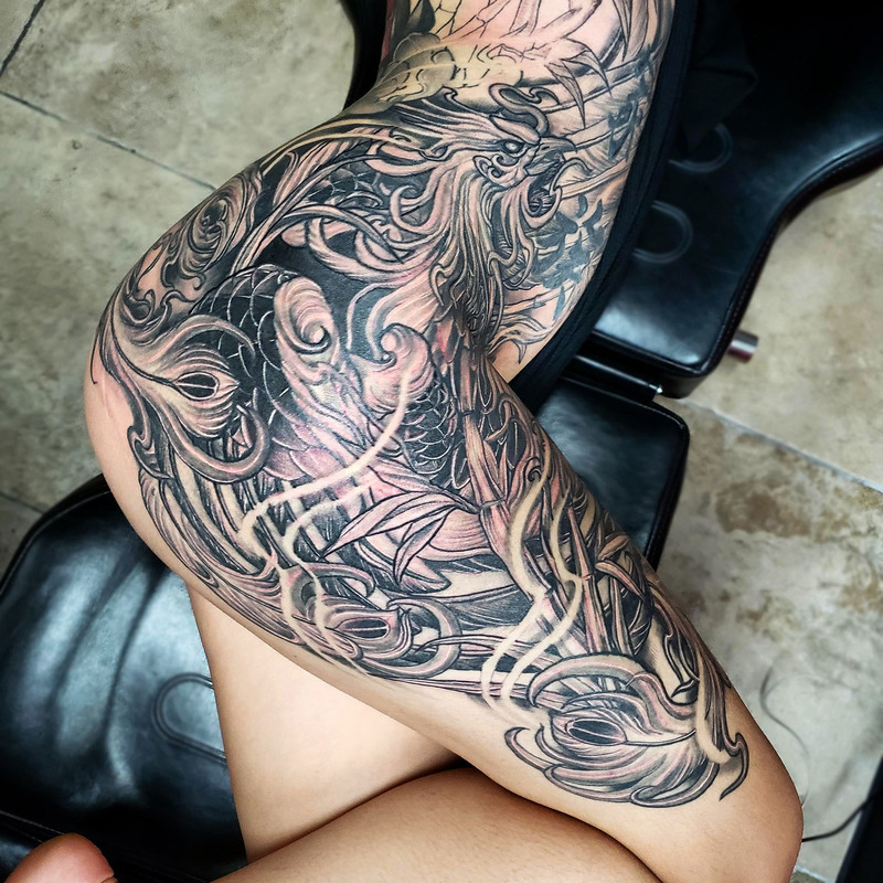 Asian American tattoos have a certain aesthetic with characteristic colors and images. Some of the most common motifs are cherry blossoms, koi, dragons, phoenixes, gods, and temples. Many of these aesthetics were pioneered by tattoo masters like Master Mike and Richard Vasak, mainstreaming the “look” of their art.